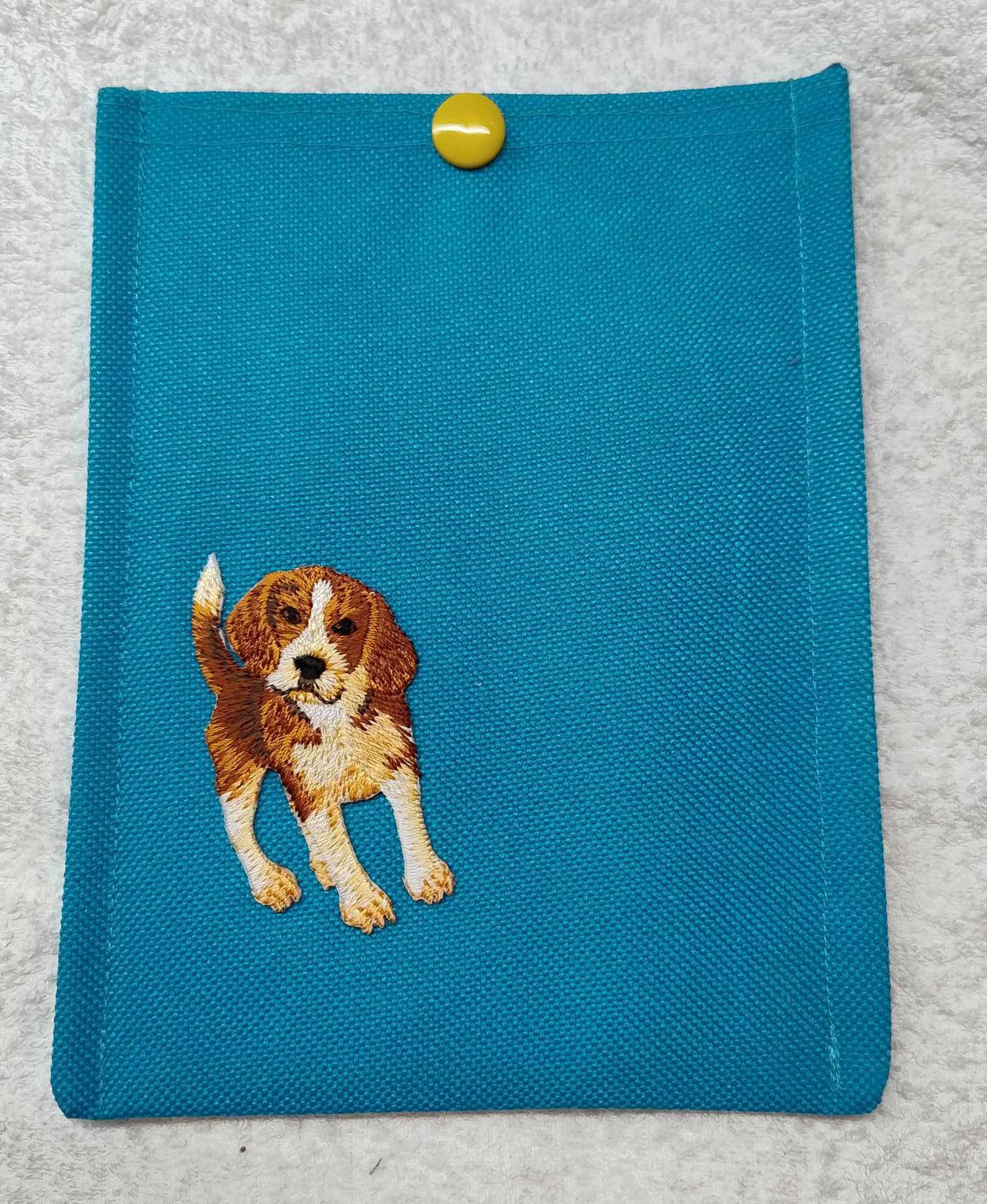 Klapphülle, außen Segeltuch innen Baumwolle mit Stickbild, Namen und Datum.